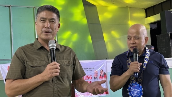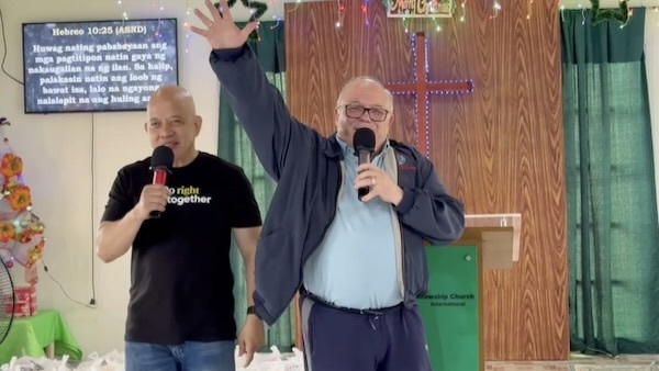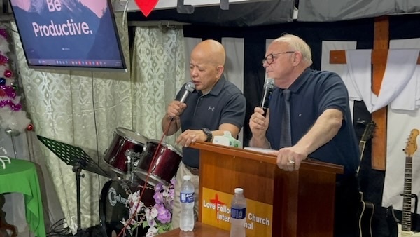Dr. Hansen preaching at the Palayan LFCI with Bishop Sanoy interpreting