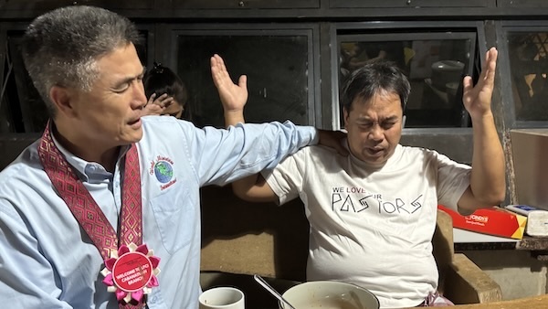 Both of us praying for this pastor